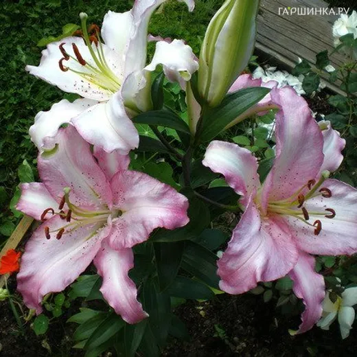Лилия Бразилия восточная розовая - Цветки бледно-розового цвета с розово-малиновой каймой по краю и розовым крапом на 1/3 лепестка. Высота 90-120 см. Стебли прочные, облиственные. Цветки лилии 27 см в диаметре. Лепестки широкие, волнистые по краям. Насыщенный, терпкий аромат. Цветет лилия в июле-августе.