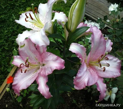 Лилия Бразилия восточная - Цветки бледно-розового цвета с розово-малиновой каймой по краю и розовым крапом на 1/3 лепестка. Высота 90-120 см. Стебли прочные, облиственные. Цветки лилии 27 см в диаметре. Лепестки широкие, волнистые по краям. Насыщенный, терпкий аромат. Цветет лилия в июле-августе.