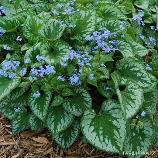 Бруннера Эмералд Мист - очень декоративный сорт с серебристо-зелеными листьями и мелкими голубыми цветками.