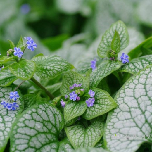 Бруннера Сильвер Стар - Имеет крупные листья в форме сердца с ярким серебристым налетом и заметными зелеными прожилками, которые привлекают внимание и добавляют яркости затененным участкам сада. Листва остается привлекательной в течение всего вегетационного периода. Весной 'Silver Star' производит нежные соцветия небольших небесно-голубых цветов, напоминающих незабудки. Идеально подходящая для тенистых или частично затененных мест бруннера Сильвер Стар процветает во влажной, хорошо дренированной почве и требует относительно небольшого ухода. Она образует аккуратные кусты, что делает ее отличным выбором для подавляющего сорняки почвопокровного растения или в качестве акцента в лесных садах и затененных бордюрах. Вырастает до высоты 45 см с возможным размахом 40 см.