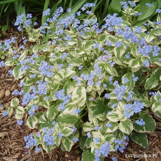 Продавец: ИНН 350902477384Бруннера Вариегата - очень декоративный сорт серебристо-зелеными листьями и мелкими голубыми цветками.