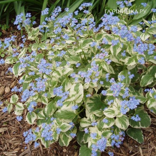 Бруннера Вариегата - очень декоративный сорт серебристо-зелеными листьями и мелкими голубыми цветками.