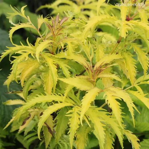 Бузина красная Плюмоза Ауреа - декоративный кустарник. Высота и диаметр до 2 м. Крона плотная и густая, по форме яйцевидная. Цветение длится до 20 дней, цветки на кисти жёлто-зелёные, появляются в мае. Плоды мелкие костянки красного цвета, являются несъедобными, созревают к концу лета. Скорость роста высокая. Листва жёлтого или золотистого оттенка, листья с пильчато-зубчатыми краями.