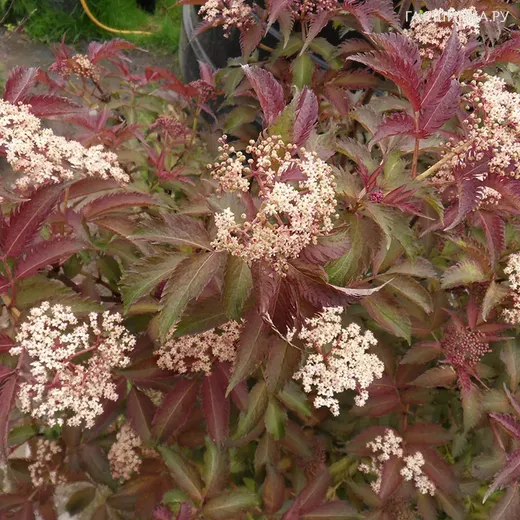 Бузина Серенада черная - куст компактный, до 250 см высотой и шириной 150 см. Растёт быстро. Молодые побеги розово-красные. Листья в начале лета меняют цвет на жёлто-зелёный, а осенью будут розово-красными. Цветки белые и бледно-розовые, в плоских соцветиях. Аромат сладкий. Цветет в конце мая - начале июня. Предпочитает солнечное место. К почве нетребователен. Зона 4 (до -34ºС).