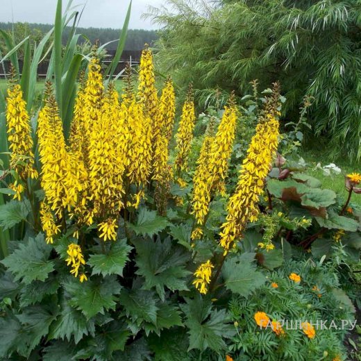 Бузульник Вильсона - известный своей декоративной привлекательностью и неприхотливостью, является отличным выбором для садоводов, стремящихся украсить свои участки. Это многолетнее травянистое растение, достигающее высоты до 1,5 метров, с раскидистой кроной и крупными листьями сердцевидной формы. Его побеги крепкие и прямостоячие, что придаёт растению впечатляющий вид. Листья бузульника имеют насыщенно-зелёный цвет, который осенью сменяется на яркие оттенки жёлтого и оранжевого, добавляя саду особую красочность.