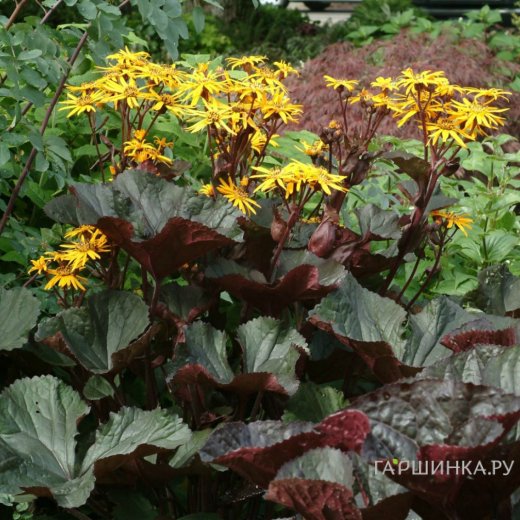 Бузульник зубчатый Миднайт Леди - это изысканное многолетнее декоративное растение, привлекающее внимание своими уникальными темно-пурпурными листьями и яркими желтыми соцветиями. Жизненная форма растения — травянистый многолетник, который достигает в высоту 80-100 см, с раскидистым характером роста. Листья крупные, зубчатые, насыщенного темно-фиолетового цвета, что создает эффектный контраст с яркими цветами. Побеги крепкие, без шипов и колючек, что облегчает уход за растением.