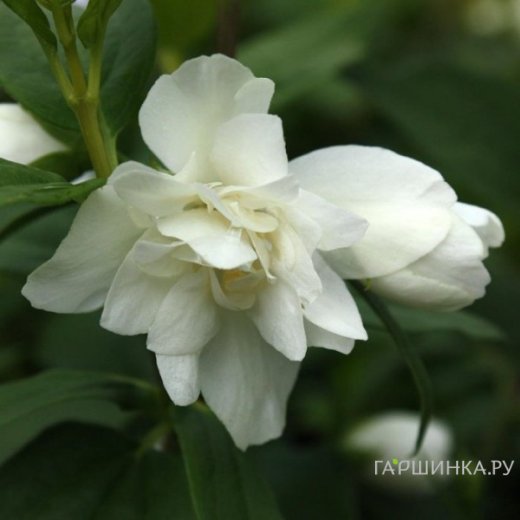Чубушник Манто Дэрмин. Быстро растущий лиственный кустарник. Высота взрослых экземпляров достигает 1,5 м. Крона раскидистая, веерообразная, густая. Концы побегов поникают. Кора серая, шелушащаяся. Листья удлиненно-яйцевидные, жесткие, с четко выраженным жилкованием, темно-зеленые. Особую декоративность приобретает в момент цветения, когда весь куст покрыт белоснежными, с желтой серединкой, густо махровыми ароматными цветами. Время цветения: июнь-июль.