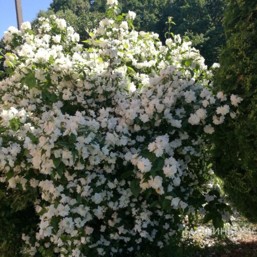 Чубушник Жемчуг - достигает в высоту всего 1,5 м, побеги красноватые, поникающие, густо покрыты зелеными листьями. Цветение очень обильное, приходится на вторую половину июня - начало июля и длится около 3-х недель. Цветы белые, махровые, с тонким ароматом ванили, собраны в небольшие кисти.