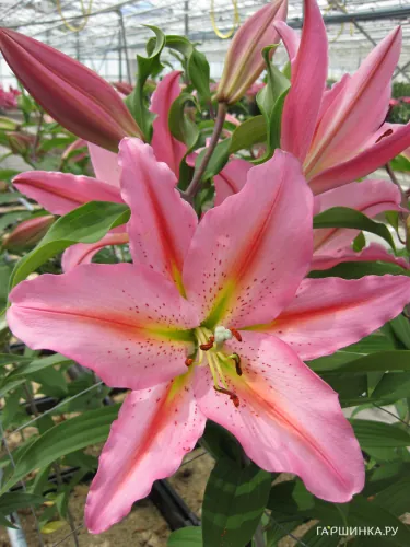 Лилия Циркус восточная /2шт - цветок розовый с тёмно-розовым крапом, жёлто-зелёным центром и оранжевыми полосами вдоль лепестков. Диаметр цветка 22 см высота - 110 см.