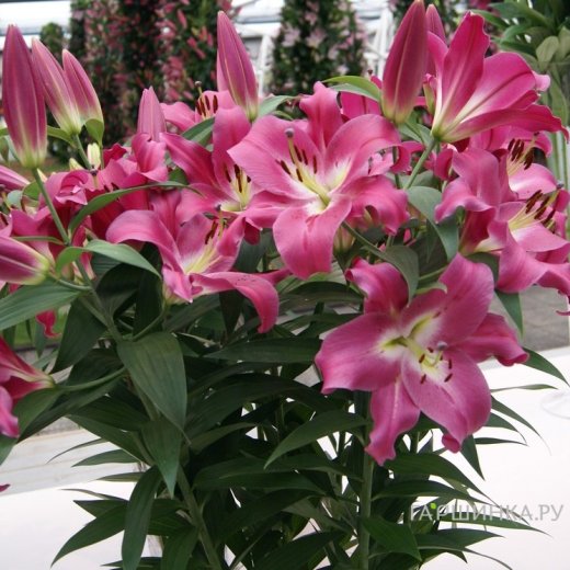 Лилия Компетишн ОТ-гибрид розовая - Лилия была получена в результате скрещивания двух видов: трубчатых (Trumpet) и восточных (Oriental) лилий. Очень крупные цветки диаметром от 20-30 см с сильно выраженным нежным и приятным ароматом и большим количеством соцветий. Иногда до 30 штук за цветение. Цветки имеют пурпурно-розовую окраску с небольшой белой звездой вокруг зеленоватого горла. Лепестки завернуты вниз. Высота растения от 110 до 150 см. Цветет в июле-августе.