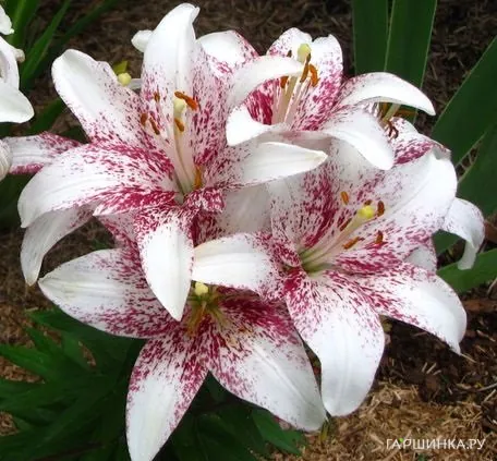 Лилия Кроссовер азиатская/2шт - Цветки яркие, белые с тёмно-бордовым частым крапом, направлены вверх, очень эффектные. Высота растения 120 см. Цветки лилии 17 см в диаметре. Нежный аромат. Период цветения июнь-июль.