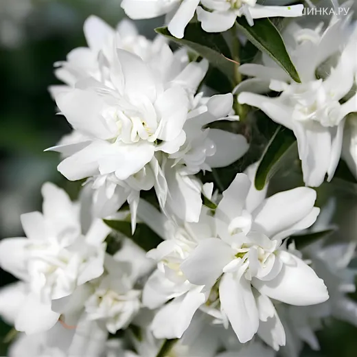 Чубушник Комсомолец - среднерослый, листопадный кустарник, который может вырастать максимально в высоту до 1,5 м и в ширину – до 2,5 м. Это довольно компактное декоративное растение с вертикальной, не разваливающейся кроной. Побеги крепкие, слегка поникают под тяжестью соцветий, но прямостоячие. Кустарник густооблиственный. Листья крупные, яйцевидной формы, черешковые, по краям зубчатые. Они имеют глянцевую поверхность и окрашены в темно-зеленый цвет (весной, летом) и в желтый (осенью). Побеги, на которых размещены цветоносы, слегка изогнуты кверху. На каждом побеге может формироваться до 22 цветоносов. Соцветия у данного вида чубушника очень плотные, пучковидные. Каждое соцветие может состоять из 5-9 махровых цветков белоснежного цвета с желтым центром. Диаметр цветка не превышает 4,5 см. Цветки обладают слабым земляничным ароматом. Их внутренние лепестки располагаются скручено, они узкие. Характеризуется ранними сроками цветения, которое начинается в июне и продолжается от 3 до 6 недель. Цветение обильное, продолжительное, сопровождается приятным ароматом.Переносит зимовку (от -34 до -29 градусов).
