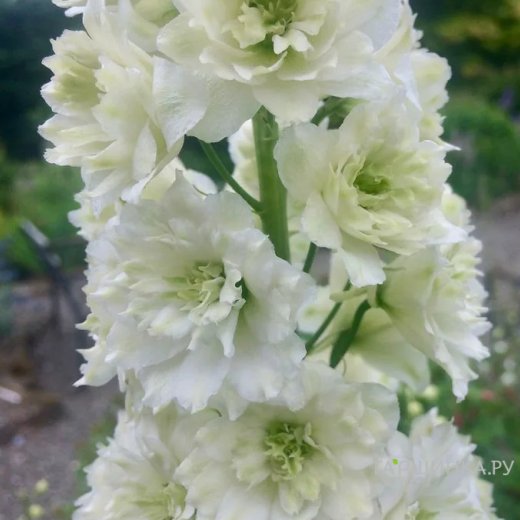 Дельфиниум Монинг Санрайз (Утренний рассвет) - многолетнее садовое растение. Шотландский гибрид высотой до 110 см. Цветки густомахровые белые с лаймовым центром, на прочных цветоносах. Соцветие достигает 80 см.
