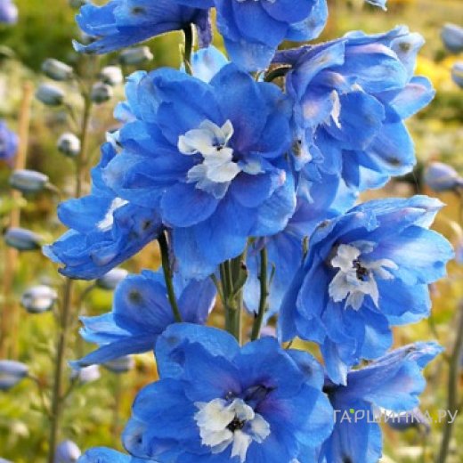 Дельфиниум Пацифик Блю Берд - многолетнее садовое растение. Куст высотой 150 см. Цветок 5-7 см в диаметре махровые крупные, синие с белым глазком. Соцветие 50 см длиной.