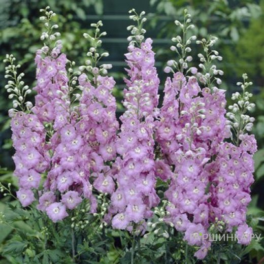 Дельфиниум Пацифик Гинивер - многолетнее садовое растение. Куст высотой 150 см. Цветки 6-7 см в диаметре полумахровые, густо-сиренево-розовые с белым глазком. Соцветие до 80 см.