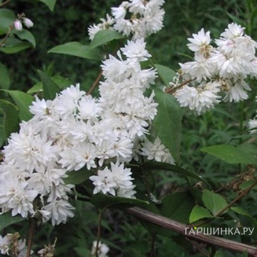 Дейция шершавая Плена - декоративный, высокий, красивоцветущий кустарник с густой кроной, образованной многочисленными прямыми побегами, немного свисающими на концах под тяжестью соцветий. В высоту достигает 3 метров, в ширину до 2 м. Ежегодный прирост в высоту 30-40 см., в ширину 20-30 см. Листья шершавые, сплошь покрытые мелкими ворсинками, эллиптические, вверху заостренные, верх листа темно-зеленый, низ-серо-зеленый, в длину 3-8 см. Цветки махровые, белоснежные внутри и нежно-розовые снаружи, собраны в узкие метельчатые соцветия, длиной до 10-12 см. Цветет позже остальных дейций, в июле. Зимостойкость дейции шершавой Plena (Плена) низкая, рекомендуется укрывать на зиму при температуре ниже  -23º С.