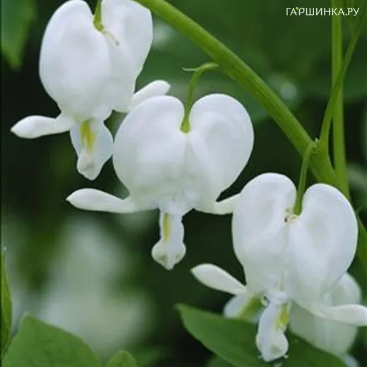 Дицентра исключительная Альба - Оригинальный многолетник. Отличается нетривиальными декоративными свойствами. Стебель плотный и мясистый. Листья перистые и резные. Стебель украшен множеством свисающих «сердечек», которые напоминают кулоны. Белые цветки отличаются небольшим размером. Обычно в диаметре они не превышают 2 см. Эти «сердечки» немного сплюснуты. Между собой они собраны в кисти поникающего типа. Средняя высота стебля составляет 70 см. У его основания собрано большинство листьев. Они отличаются насыщенным зелёным оттенком, а с обратной стороны имеют лёгкий сизый подтон.