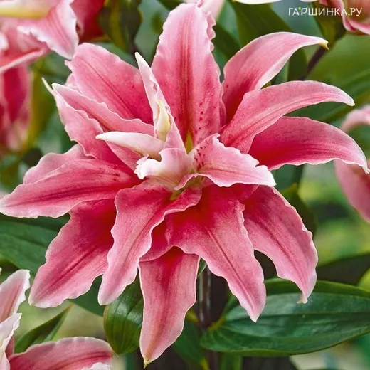 Лилия Дистант Драм восточная махровая - Цветки темно-розового цвета с более светлым оттенком по волнистым краям лепестков. Цветок густомахровый. Высота 100 см. Стебли прочные, облиственные. Цветки лилии 20 см в диаметре. Насыщенный аромат. Период цветения июль-август.