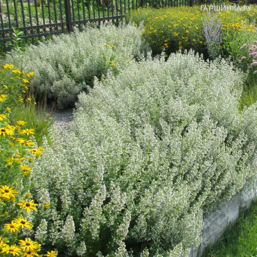 Душевик котовниковый Вайт Клауд - неприхотливое, светолюбивое растение. Высота во время цветения до 40 см, диаметр куста 50-70 см. Цветет в июне-августе. Цветки мелкие, белые, собраны в щитковидное соцветие. Цветение обильное. Почвы предпочитает хорошо дренированные, супесчаные, рыхлые, от слабо кислых до щелочных. Засухоустойчив, но лучшего развития достигает при регулярном поливе. На переувлажненных почвах зимой выпревает. На зиму лучше прикрывать листвой. На одном месте растет 3-4 года.