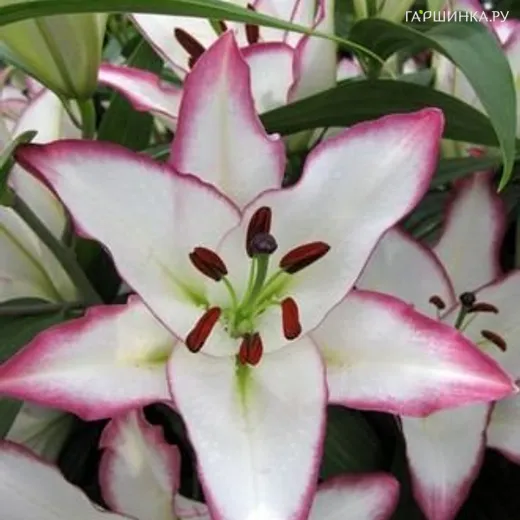 Лилия Зе Эдж восточная Цветы крупные, чисто-белые с ярко-розовым краем, до 25 см. Высота до 90 см. Время до цветения: 100-110 дней. Неприхотливая.