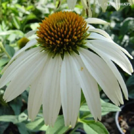 Эхинацея Примадонна Вайт пурпурная – многолетнее травянистое корневищное растение. Куст высотой до 100 см. Листья простые, овальные, по краю зубчатые, шершавые. Соцветия – корзинки, диаметром до 10-12 см, со светло-коричневой серединкой и белыми цветками до 4 см длиной, на верхушке заостренные. Цветет с июля по сентябрь.