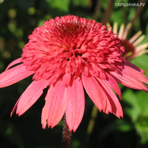 Эхинацея Расберри Трафл – многолетнее травянистое корневищное растение. Куст высотой до 80 см, шириной 60-75 см. Появляются оригинальные, махровые соцветия красно-розового оттенка, центр коричневый. Растение имеет плотные, прочные стебли коричневого цвета. Начинает цвести в середине лета.
