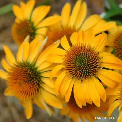 Эхинацея пурпурная Харвест Мун – многолетнее травянистое корневищное растение. Куст высотой до 70 см. Листья зеленые, зубчатые, опушенные. Цветки крупные, до 10 см в диаметре, с ярко-желтыми язычковыми лепестками и выпуклым коричневым центром. Цветет с июля по сентябрь.