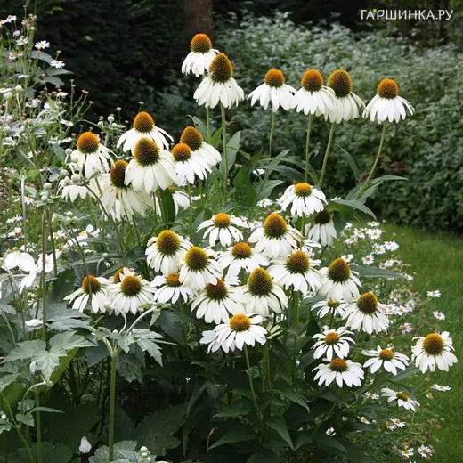 Эхинацея пурпурная Альба - образует куст из прямых прочных побегов диаметром до 60 см. Листья темно-зеленые, шершавые, по краю зубчатые. Сорт морозоустойчив и растение не нужно укрывать на зиму. Высота взрослого многолетника достигает 120 см. Цветы широкие, с белыми лепестками и большими темно-желтыми серединками.