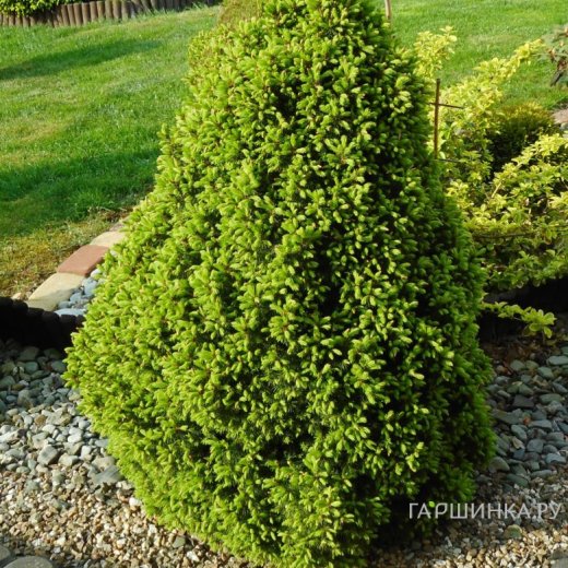 Ель канадская Коника - Самая популярная коническая форма. Растёт медленно. При благоприятных условиях высота может составить до 3 м, но чаще вырастает до 1 м. Крона узко-конусовидная, плотная. Хвоя сизо-зеленого цвета, мягкая, тонкая и короткая. Корневая система представлена компактным, слабовыраженным стержневым корнем. Преобладающая часть корней располагается достаточно близко к поверхности почвы, поэтому рыхление должно быть осторожным. Данный сорт ели удобен тем, что уход за ним минимальный. Она не нуждается в уходе за кроной – ей не нужна обрезка. Эффектна в самых разнообразных композициях: на партере, в групповых посадках. Рекомендуется для выращивания в контейнерах на крышах, террасах, для групповых посадок возле домов, для оформления каменистых садов. Теневынослива.