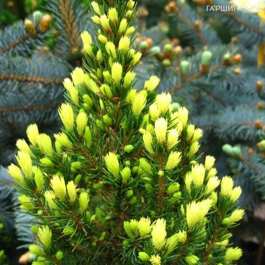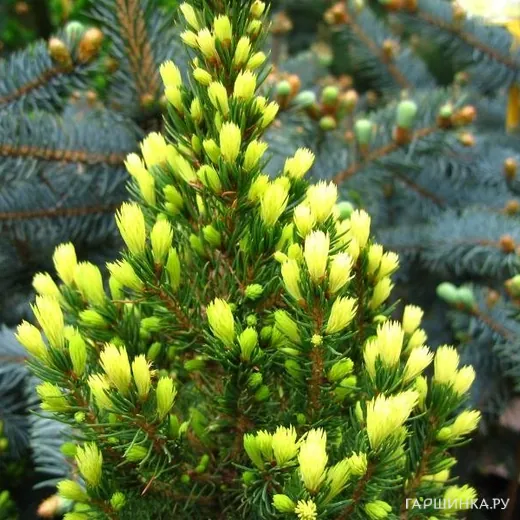 Ель канадская Рэйнбоуз Энд - Карликовое деревце ростом до 1,5-2 м. В 10 лет высота до 1 м, при диаметре 0,6 м. Растет очень медленно, по 5-6 см. В молодом возрасте побеги развиваются неравномерно: нижние интенсивнее, а верхние как бы отстают от них в развитии. В результате крона формируется в виде широкого абсолютно неправильного и несимметричного конуса с резко заостренной вершиной. С возрастом этот недостаток исчезает, и силуэт деревца становится правильным, ширококонусовидным или пирамидальным. Привлекает хвоя этого сорта, она мягкая, нежная, тонкая, длиной около 1—1,5 см, окрашена в ярко-зеленый цвет. Молодая хвоя — кремово-желтая или светло-зеленая, ближе к середине лета окраска кроны выравнивается. В полутени жёлтая окраска свежего прироста тускнеет, в тени изменится на зеленый. Для того, чтобы прекрасный карликовый конус оделся в золото, следует сажать его исключительно на солнце. Ель Rainbow's Еnd в марте-апреле нужно защитить от прямых солнечных лучей с южной стороны не только в детском, но и в более зрелом возрасте.