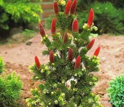 Ель колючая Лаки Страйк - медленно растущее хвойное карликовое дерево с широкой неправильной конической формой кроны. Высота взрослого растения не превышает 2 м, диаметр до 1,5 м. В 10-летнем возрасте не превышает 1,2 м и немного меньшего диаметра. Хвоя короткая, темно зеленая, блестящая, жесткая, 2-3 см длиной. Молодые приросты желто-зеленого цвета. Ветви изогнуты. Имеет очень эффектные крупные шишки - вначале лилово-красные, затем коричневеют, по 10-15 см длиной. Морозостойка. Хорошо переносит обрезку.