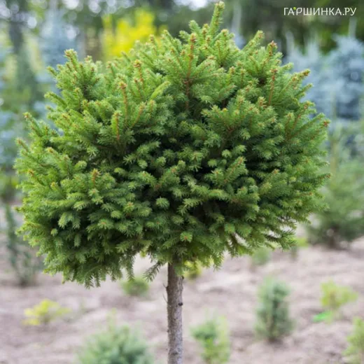 Ель обыкновенная Пигмея на штамбе 40 см - хвойное карликовое растение. Взрослое растение к 10 годам лишь 0,4 м высотой, диаметр 0,4 м. Скорость роста в год до 10 лет очень низкая, 3-7 см. Хвоя очень плотная, густая, короткая, игольчатая, темно-зеленая. Ветви короткие, частого роста.