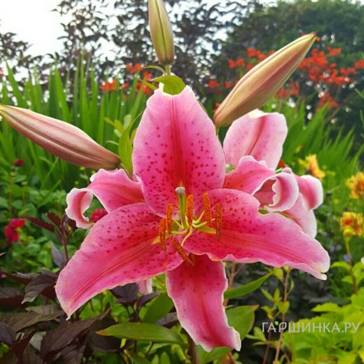Лилия Энтертейнер восточная низкорослая / 2шт -  Цветки малиново-розовые с белым центром и тёмно-розовым крапом и гофре. Высота 40-50 см. Стебли прочные, облиственные. Цветки лилии 16-18 см в диаметре. Насыщенный сильный аромат. Цветет в июле-августе.