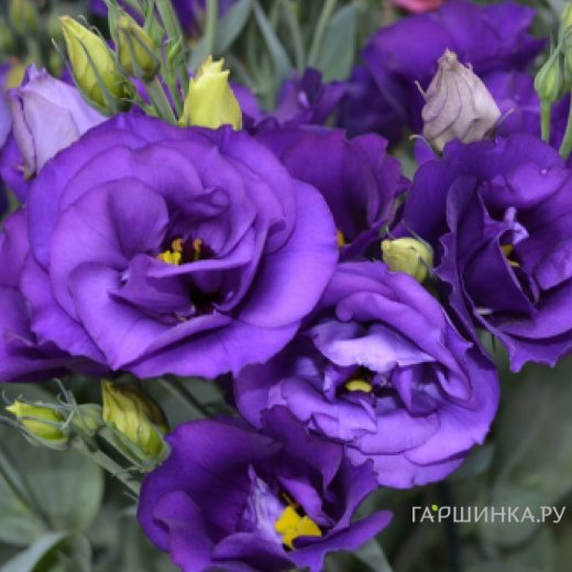 Эустома Пурпл - соцветия крупные махровые, 5-6 см в диаметре. Высота растения – 90-115 см. Предпочитает полутень, не переносит сильного порывистого ветра. Растение отлично сохраняет свежий вид в вазе.