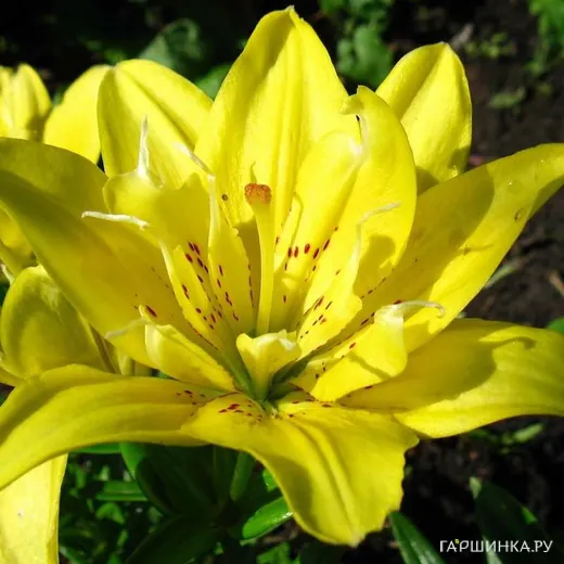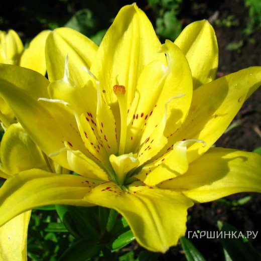 Лилия Фата Моргана азиатская махровая Цветок желтый в темно-красных точках, крап на треть каждого лепестка; рыльце умеренно красновато-коричневое. Цветки махровые, с 12 лепестками, 15 см в диаметре. Высота растения 100 см. Цветки лилии без запаха и пыльцы. Махровость показывает на второй год. Период цветения июнь-июль.