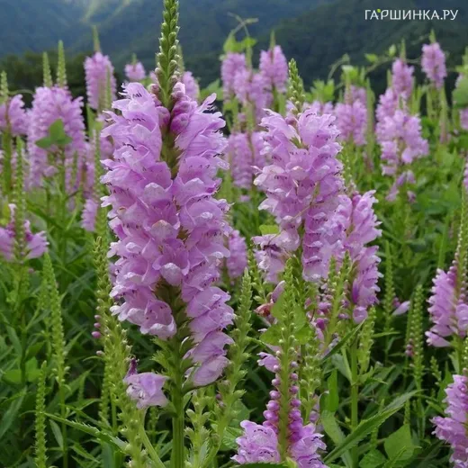 Физостегия виргинская - Высота растения составляет 60-120 см. Побеги прямые, крепкие, имеют четырехгранную форму. Корни ползучие, отличаются довольно быстрым ростом. Ланцетные сидячие листовые пластины удлинены, с неровными, зубчатыми краями, располагаются попарно. Их окрас – светло-изумрудный. Бутоны трубчатые, двугубые, со снежно-белой, светло-фиолетовой, розовой или вишневой окраской. Своим описанием они немного напоминают лилейник. Плейхоазии могут достигать в длину 30 см. Цветут представители данного вида примерно с середины августа и до последних чисел сентября. Соцветия отличаются ярким ароматом, завлекающим насекомых. После окончания цветения на побегах созревают орехообразные семенные коробочки, которые способны к самосеву.