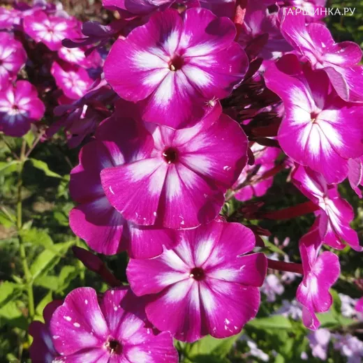 Флокс Кураж метельчатый - цветение обильное и продолжительное. Оно начинается в июле и продолжается до начала сентября. Соцветия этого сорта имеют коническую форму и крупные размеры. Длина соцветия составляет около 20 см, а диаметр цветка — 6 см. Окраска цветков очень привлекательная. Они пурпурно-фиолетовые с белой звездой и малиновым кольцом. Лепестки имеют округлую форму. Аромат у этого сорта легкий.