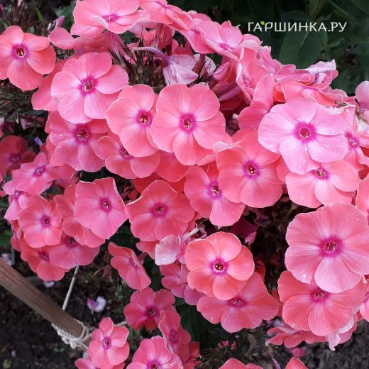 Флокс Лариса - Лососевого цвета с двойным фиолетово-белым кольцом в середине. Соцветие плотное, округло-коническое. Высота взрослого растения 60 см. Цветки в диаметре до 4 см. Срок цветения ранний.