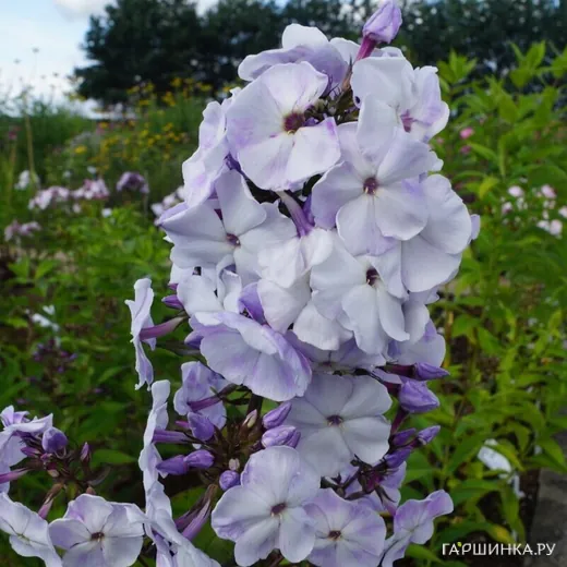 Флокс Любовь Орлова - Цветок светло-сиреневый с белым центром, фарфоровой текстуры. В жару светлеет. Соцветие округлое, плотное. Компактный прочный куст. Быстро разрастается. Высота взрослого растения 75 см. Цветки в диаметре до 4,2 см. Цветение июль-август.