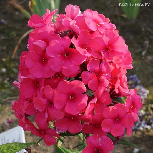 Флокс Маргарита Цветок красно-малиновый, яркий, густого насыщенного тона с более темным глазком, зацветает в июле. Не выгорает. Соцветие округло-коническое, плотное. Куст компактный, прочный. Размер цветка 4.5 см. Высота куста 75 см.