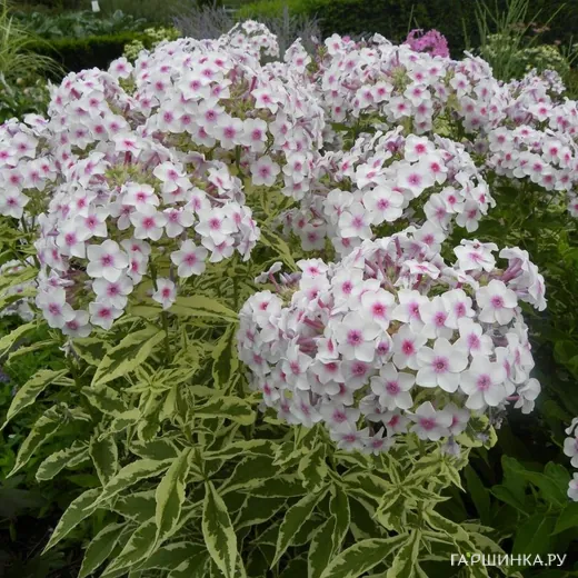 Флокс Крем де ла Менте метельчатый Куст высотой 70 см. Листья пёстрые, зелёные с кремовой каймой. Соцветие плотное округло-коническое. Цветки розовые с тёмно-розовым глазком. флокс Creme de la Menthe привлекает внимание пёстрыми листьями и декоративен даже до цветения.