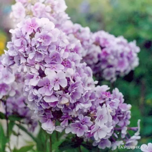 Флокс Лаванделвольке метельчатый - Цветок бледно-сиреневый с пурпурно-фиолетовой звездочкой, соцветие крупное, плотное, куст полураскидистый. Высота растения 120 см. Цветение июль-август. Размер цветка 4 см. Зимостоек.