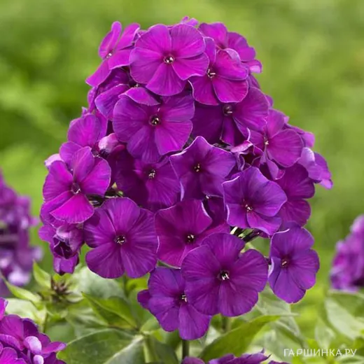 Флокс Ники метельчатый - Окраска цветков может быть от чисто-белой до чернильно-фиолетовой, в зависимости от состава почвы и условий произрастания. Часто в окраске присутствуют мазки, пятни, глазки. Высота куста до 100 см. Цветки диаметром 3,5 см собраны в пышные метельчатые соцветия. Соцветие среднеплотное, округлое. Период цветения: июль-август.