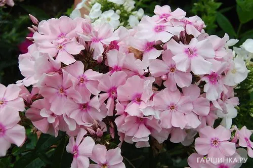 Флокс метельчатый Рови - цветок нежно-розовый с розовым глазком, диаметром 4 см. Высота растения 50-60 см. Время цветения с июля по сентябрь.