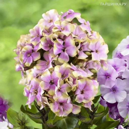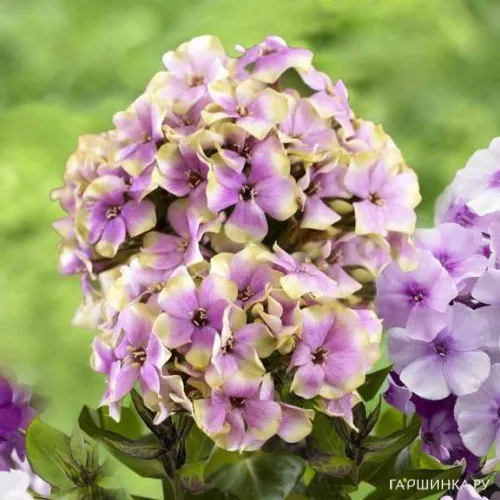 Флокс метельчатый Щербет Коктейл - У цветков смешанная окраска: розовая, кремово-желтая и нежно-зеленая. Причем в одном соцветии могут быть как цветки разных чистых цветов, так и розовые с кремово-желтым или кремово-зеленым ободком. В целом все соцветие смотрится действительно как сложный коктейль неярких красивых тонов. Высота взрослого растения: 70 см. Размер цветка 1,5 см. Цветение: август-сентябрь.