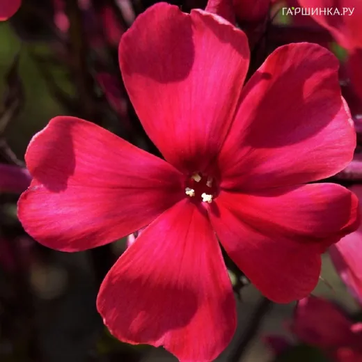Флокс Старфайр метельчатый - Побеги пурпурные, листья тёмно-зелёные с пурпурным оттенком. Цветки малиново-красные, очень яркие, звёздчатой формы. Высокое многолетнее растение, образующее прочный, компактный куст. Соцветия округло-конические, среднего размера и плотности. Высота растения 75-80 см. Цветки в диаметре 3,5-3,7 см. Зацветает в конце июля - середине августа.