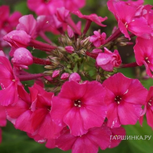 Флокс Нелли - Ослепительно яркий, малиновый с пурпурным колечком цветок. В процессе цветения вокруг колечка появляются высветленные мазки, которые проявляются еще сильнее во второй фазе цветения. Куст прочный. Очень низкий сорт, высота взрослого растения 40-45 см. Цветки в диаметре до 4 см. Цветение июль-август.