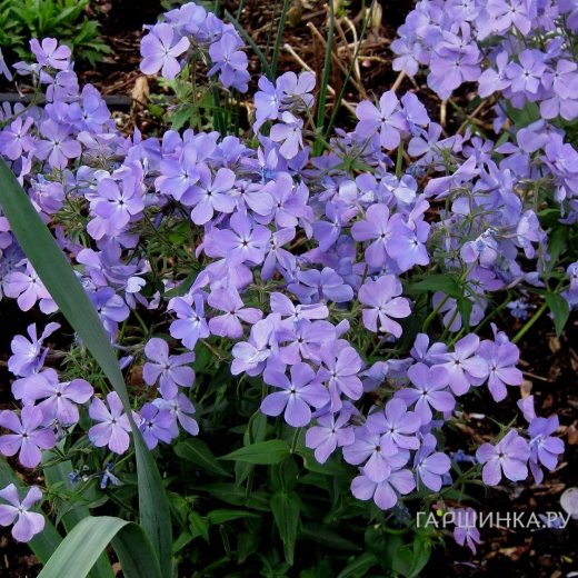 Флокс Блу Мун растопыренный - эффектный низкорослый, почвопокровный многолетник. Куст быстрорастущий, высота 30-40 см, формируется легко. Цветение продолжительное, обильное. Многочисленные мелкие цветки простые, голубые, с фиолетовым оттенком. Зона зимостойкости 4.