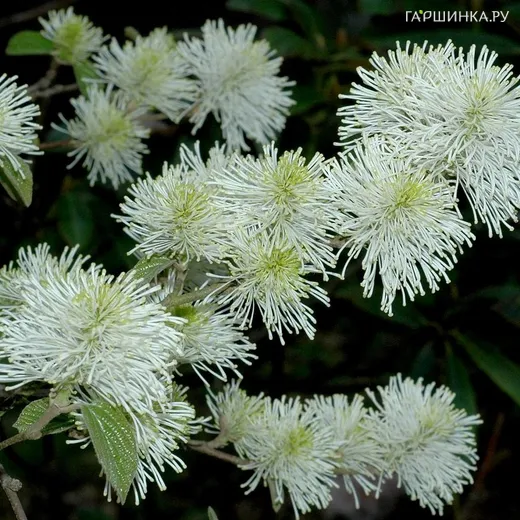 Фортегилла крупная - декоративный, листопадный кустарник сплюснутой формы. Куст прямостоячий, 1,0 м, формируется легко, побеги густые, многочисленные, вертикальные. Лист темно - зеленый, овальный, осенью ярко-желтые с красными разводами. Окраска цветка кремово-белая, цветок крупный, собраны в соцветия ершик.