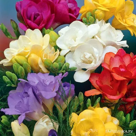 Фрезия Микс 8 шт — красивоцветущее клубнелуковичное растение, высотой 30 см. Выращивать его можно как в саду, так и дома. Листья имеют поникающую мечевидную форму. Цветки махровые, воронковидные, диаметром до 6 см, собраны в кистевидные соцветия по 10–12 шт. Окраска цветков фрезии может быть всех цветов радуги: белой, кремовой, жёлтой, оранжевой, розовой, красной, сиреневой, голубой, фиолетовой.